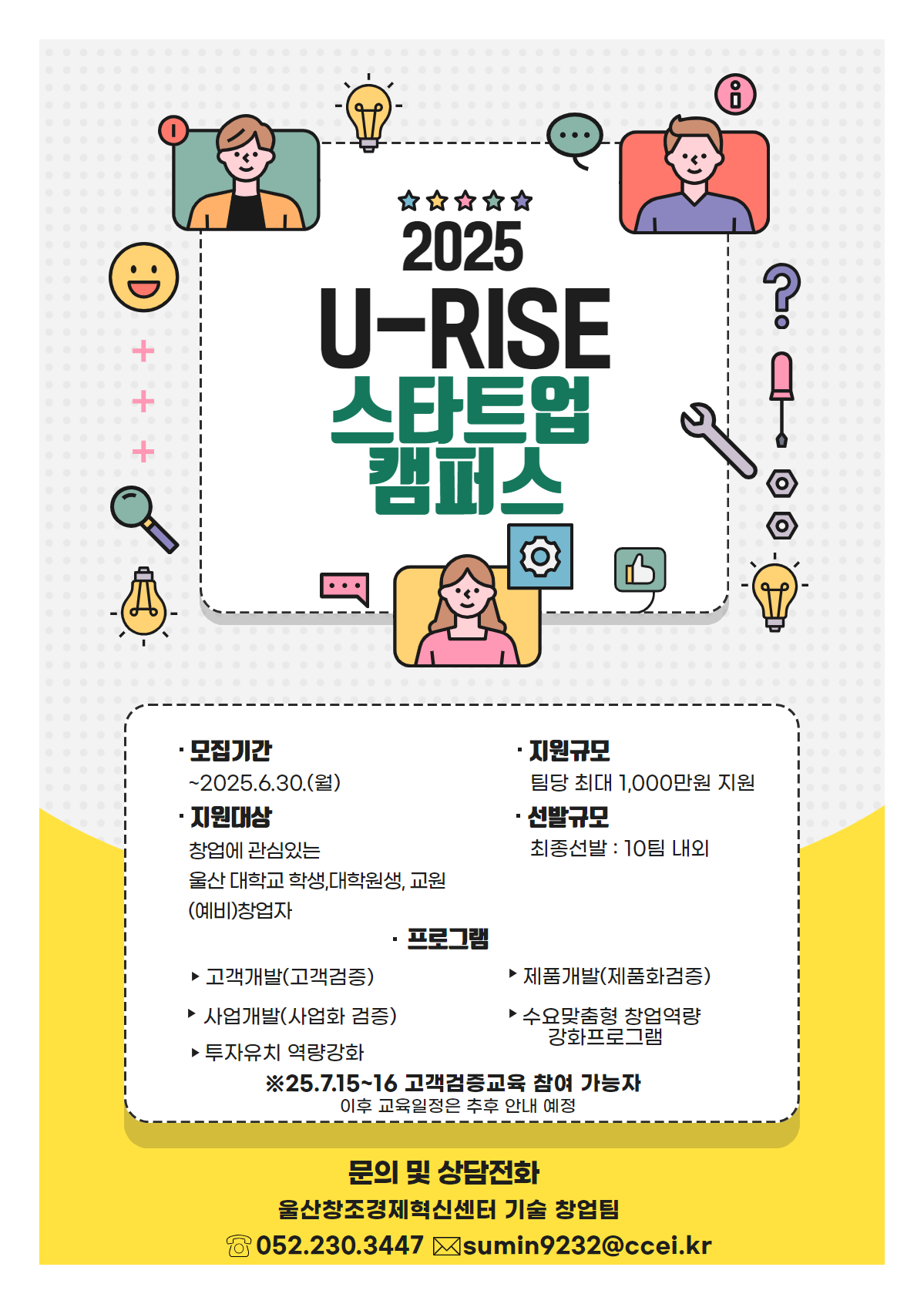 가. 프로그램명 : U-RISE 스타트업 캠퍼스 나. 지원 대상 : 창업에 관심 있는 울산대학교 학생, 대학원생, 교원, (예비)창업자 다. 지원규모 : 팀당 최대 1000만원 지원 라. 선발규모 : 최종선발 10팀 내외 마. 프로그램 안내 1) 고객개발(고객검증) 2) 제품개발(제품화검증) 3) 사업개발(사업화검증) 4) 수요맞춤형 창업역량 강화프로그램 5) 투자유치 역량강화 바. 참가신청 1) 모집기간 : ~2025.6.30.(월) 2) 신청방법 : 신청서류 메일로 제출(sumin9232@ccei.kr)