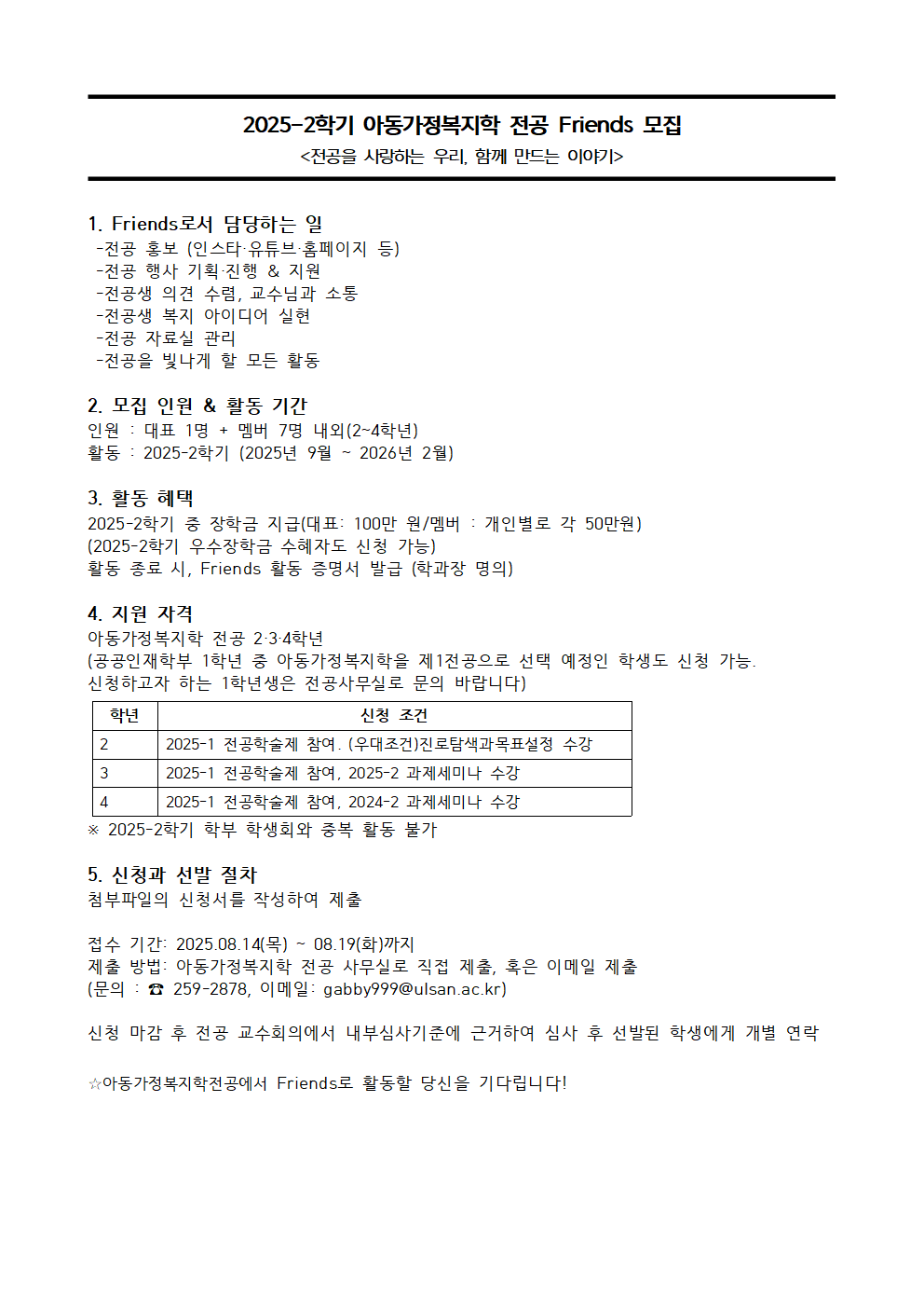 2025-2학기 아동가정복지학전공 Friends(장학생) 모집